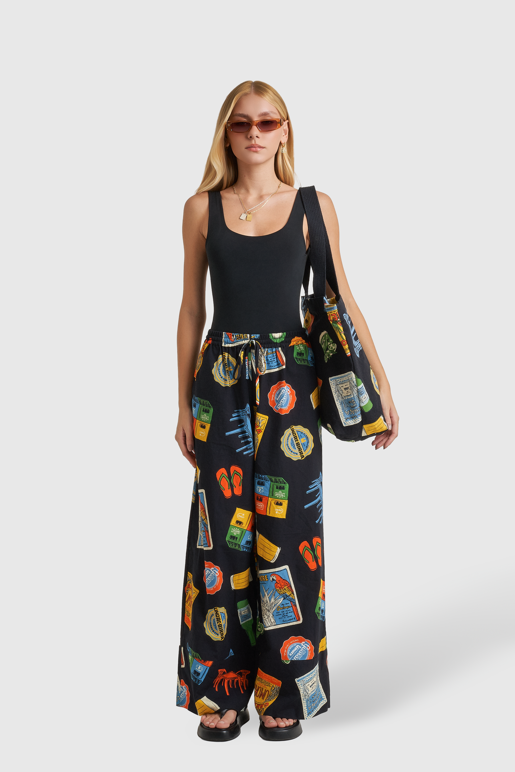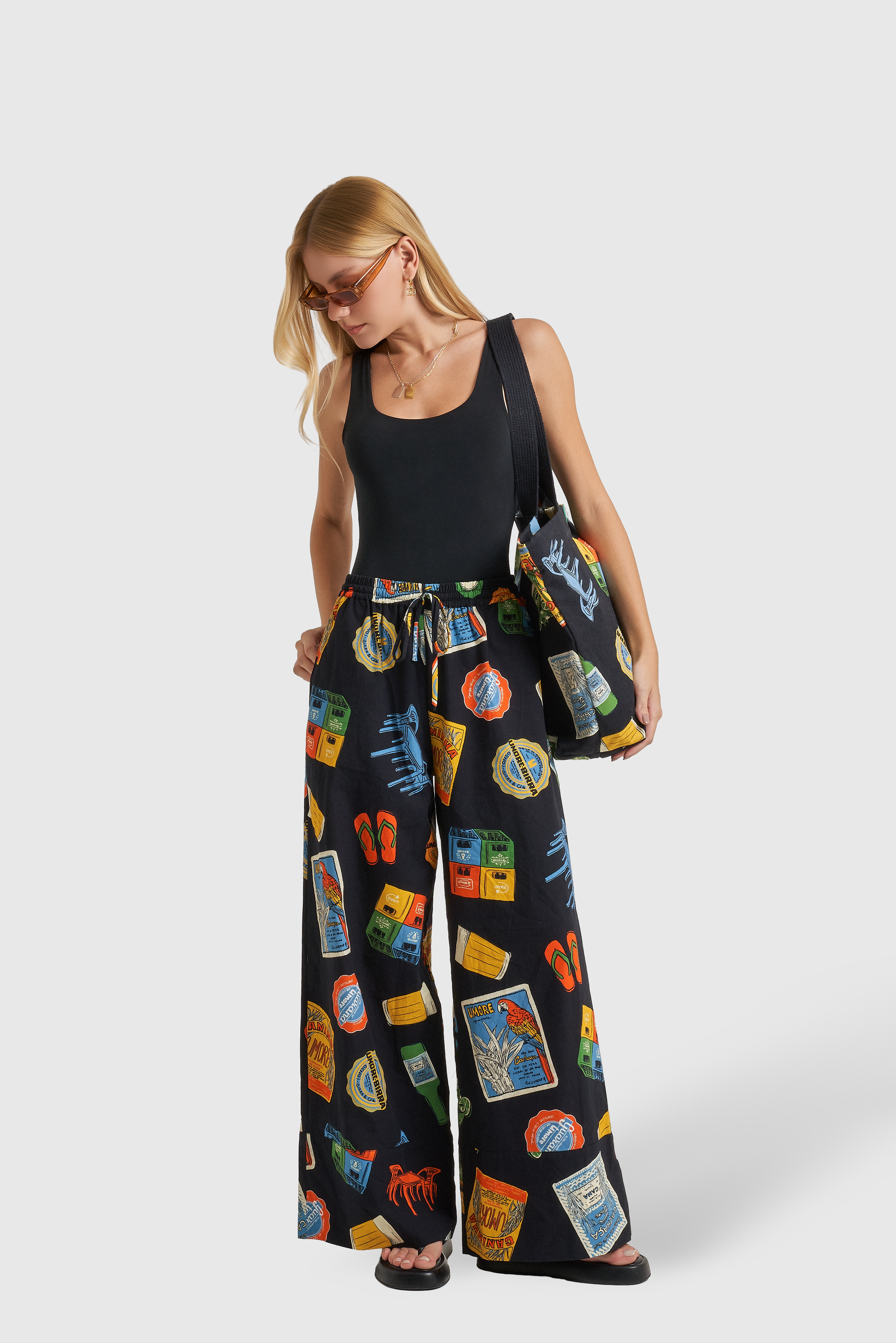 A estampa, com elementos em escala maior, resgatam ícones clássicos do nosso cotidiano: o tradicional copo americano, os petiscos de boteco, os azulejos cheios de história, tipografias retrô e o humor irreverente que só o brasileiro sabe traduzir.