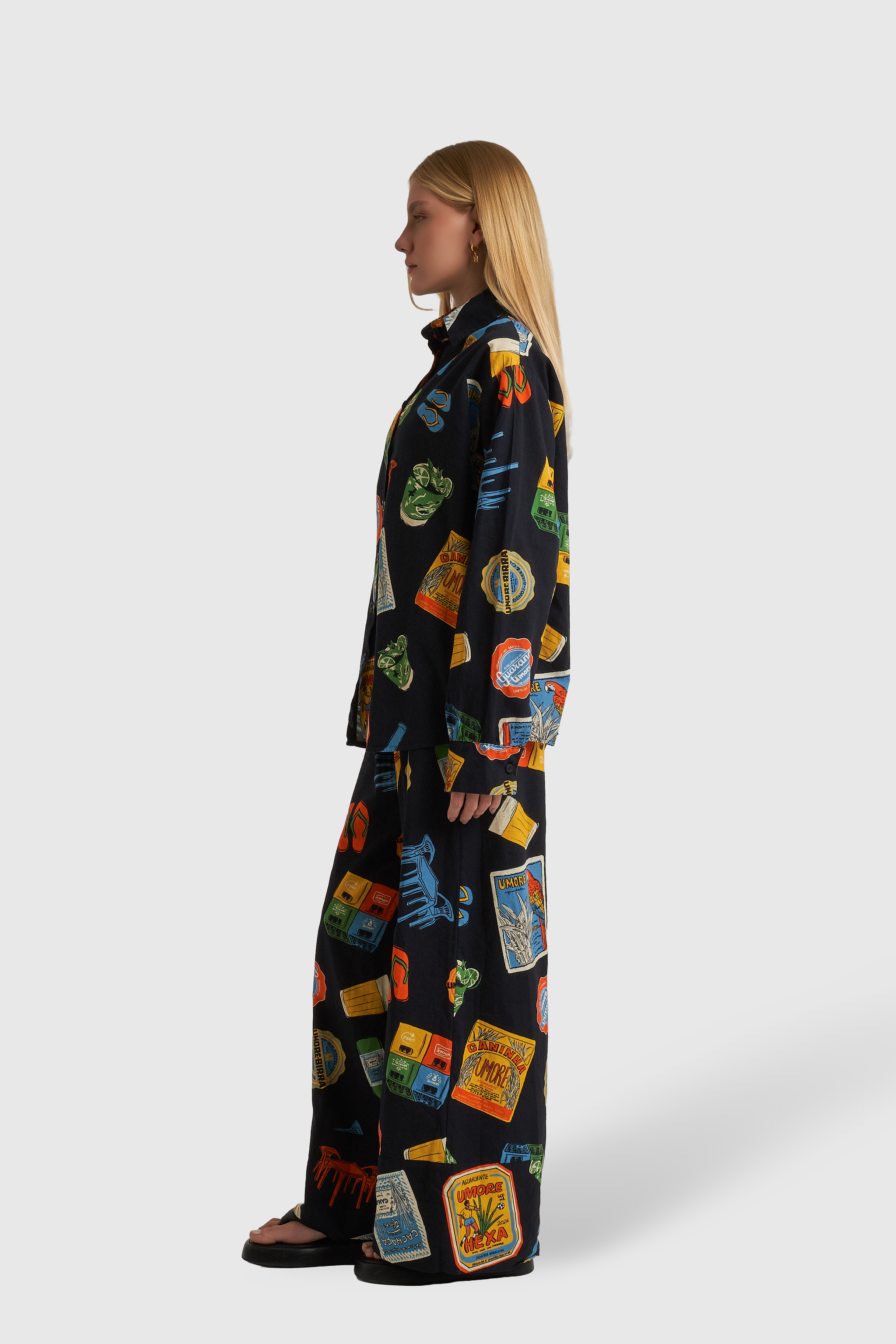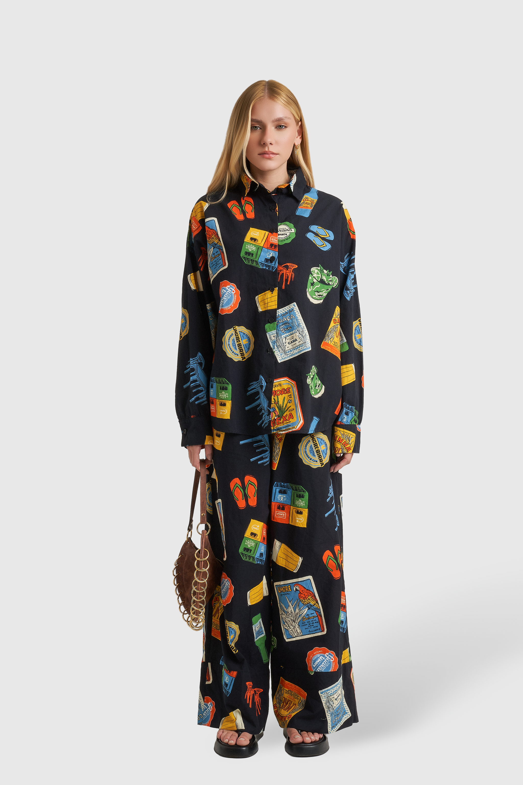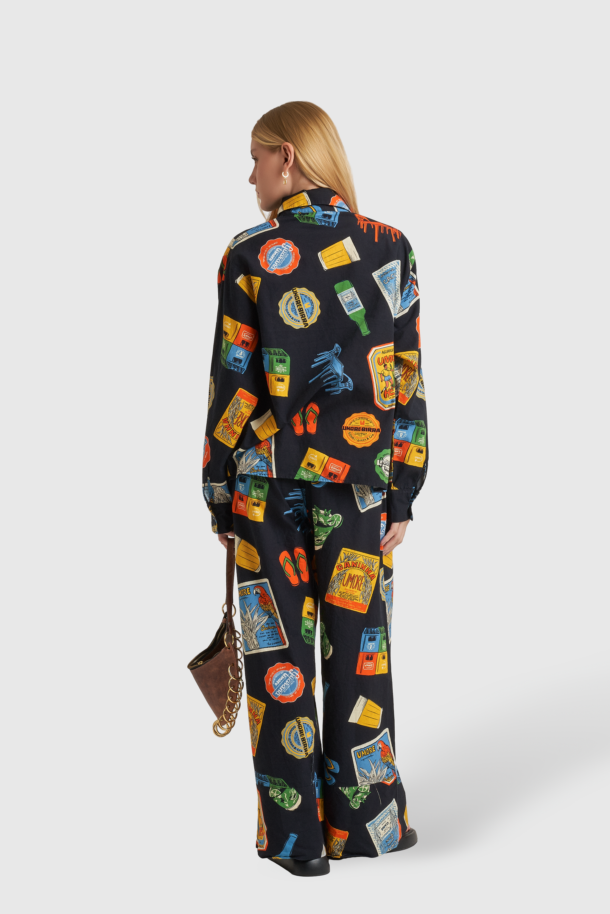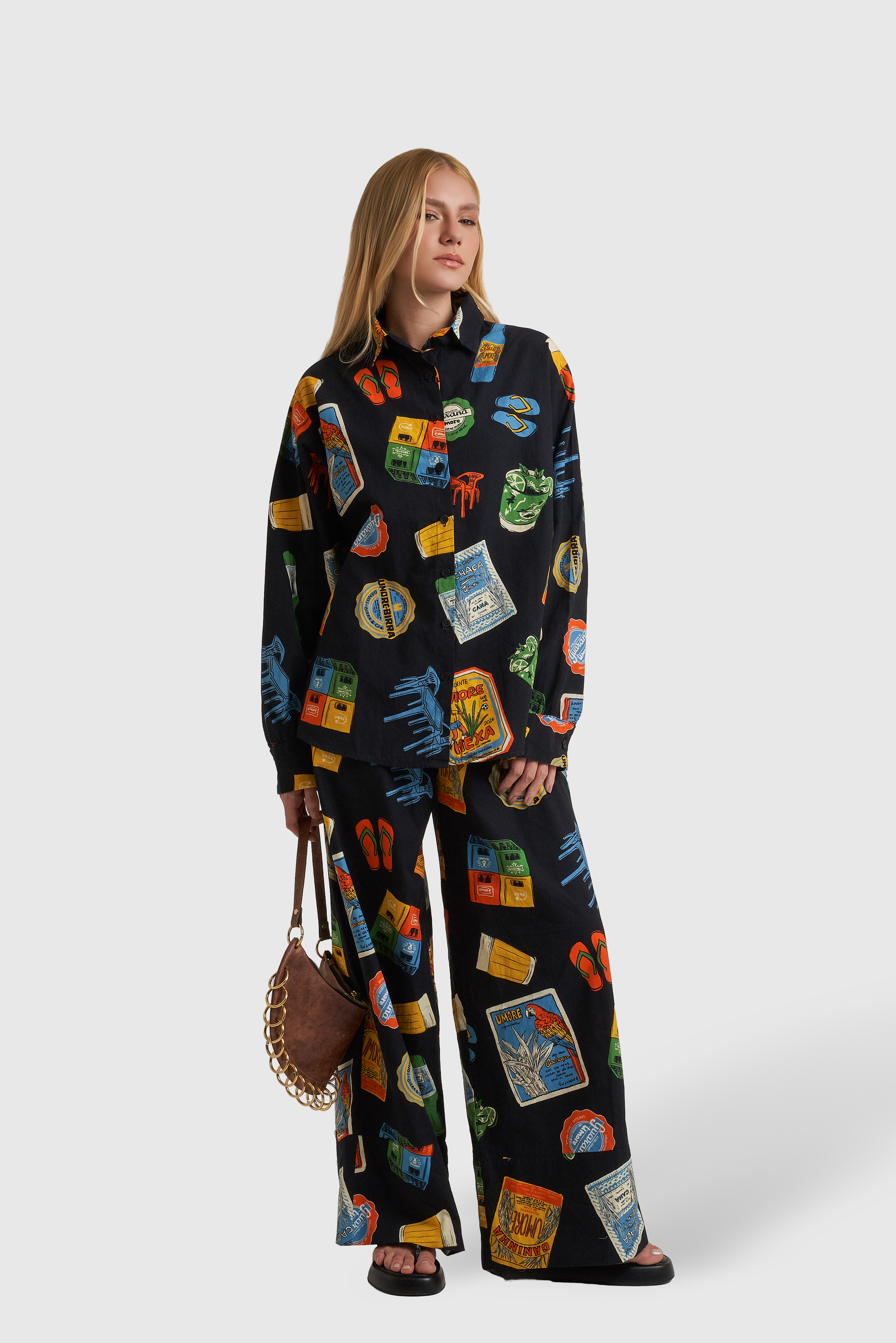 A estampa, com elementos em escala maior, resgatam ícones clássicos do nosso cotidiano: o tradicional copo americano, os petiscos de boteco, os azulejos cheios de história, tipografias retrô e o humor irreverente que só o brasileiro sabe traduzir.