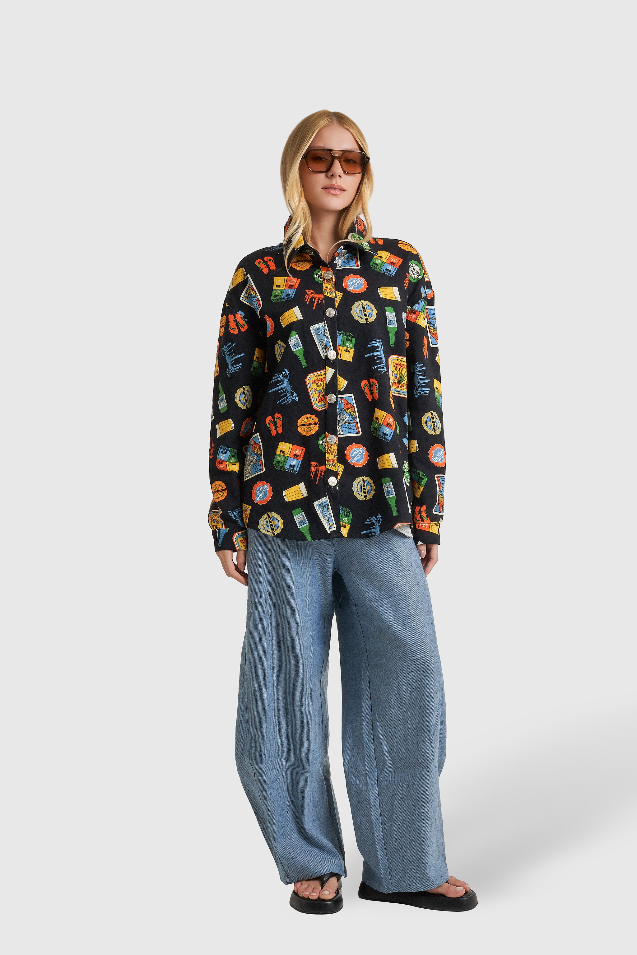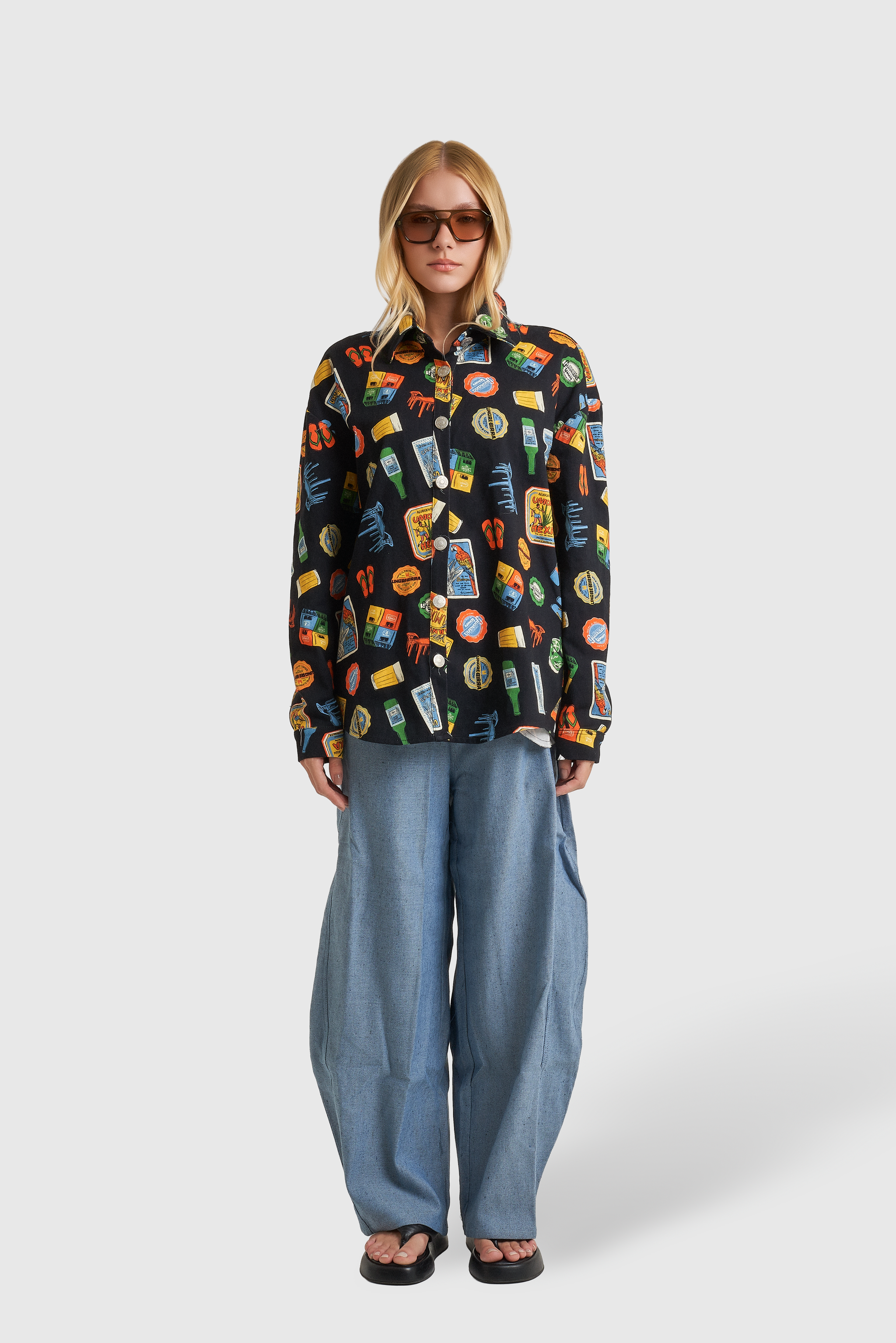 A estampa, com elementos em escala menor, resgatam ícones clássicos do nosso cotidiano: o tradicional copo americano, os petiscos de boteco, os azulejos cheios de história, tipografias retrô e o humor irreverente que só o brasileiro sabe traduzir.