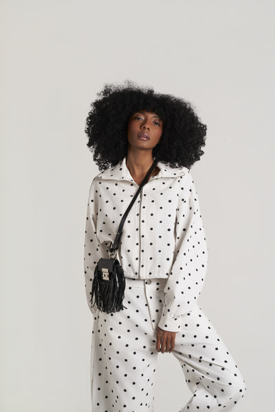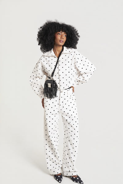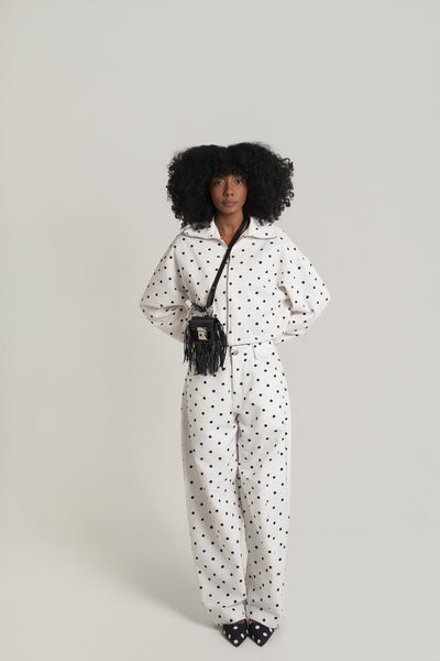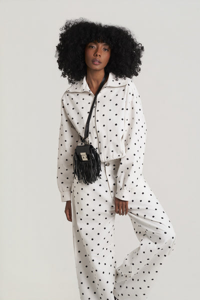 Calça Polka White: onde o vintage encontra a modernidade em perfeito equilíbrio. Tecida em sarja de alta durabilidade, sua modelagem generosa garante conforto e movimento sem renunciar à sofisticação. O poá, marca distintiva das criações 2025, resgata um padrão clássico com nova relevância, provando que verdadeiro refinamento transcende tendências. Versátil por natureza, flui entre contextos casual-elevado e elegância acessível com igual graça.