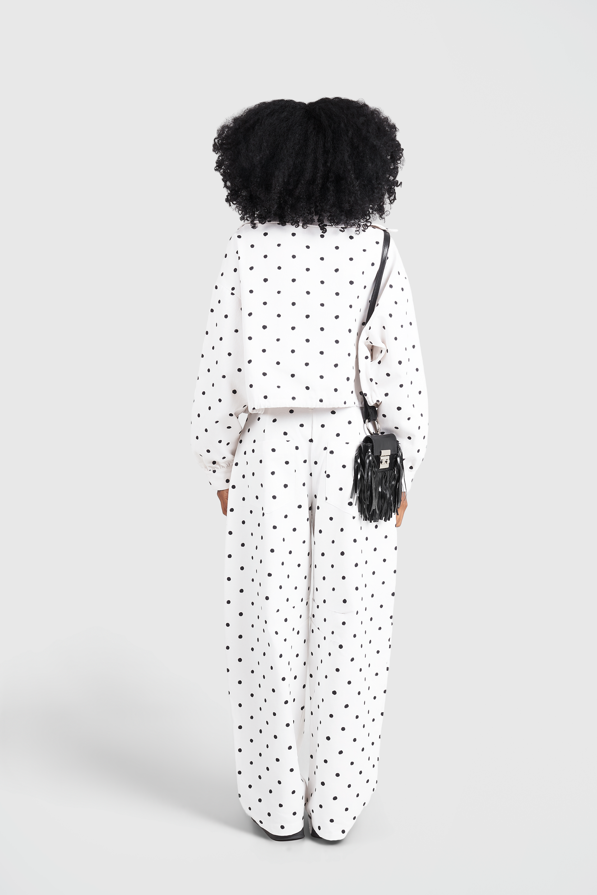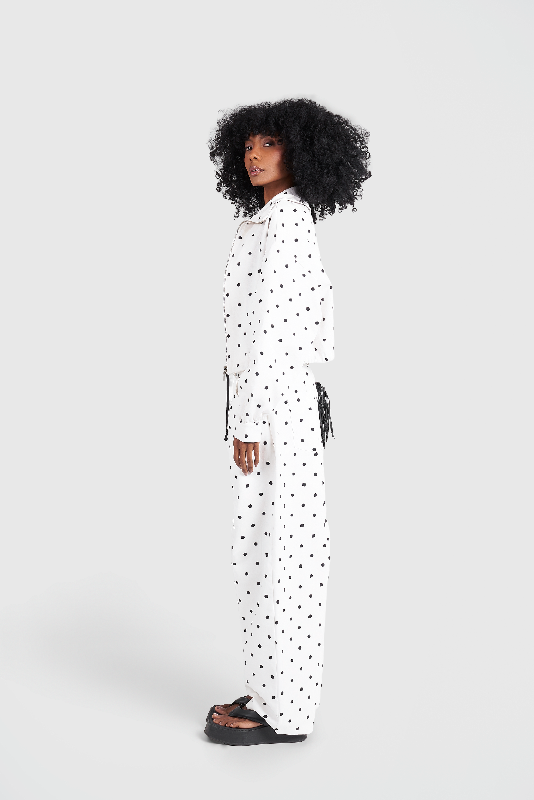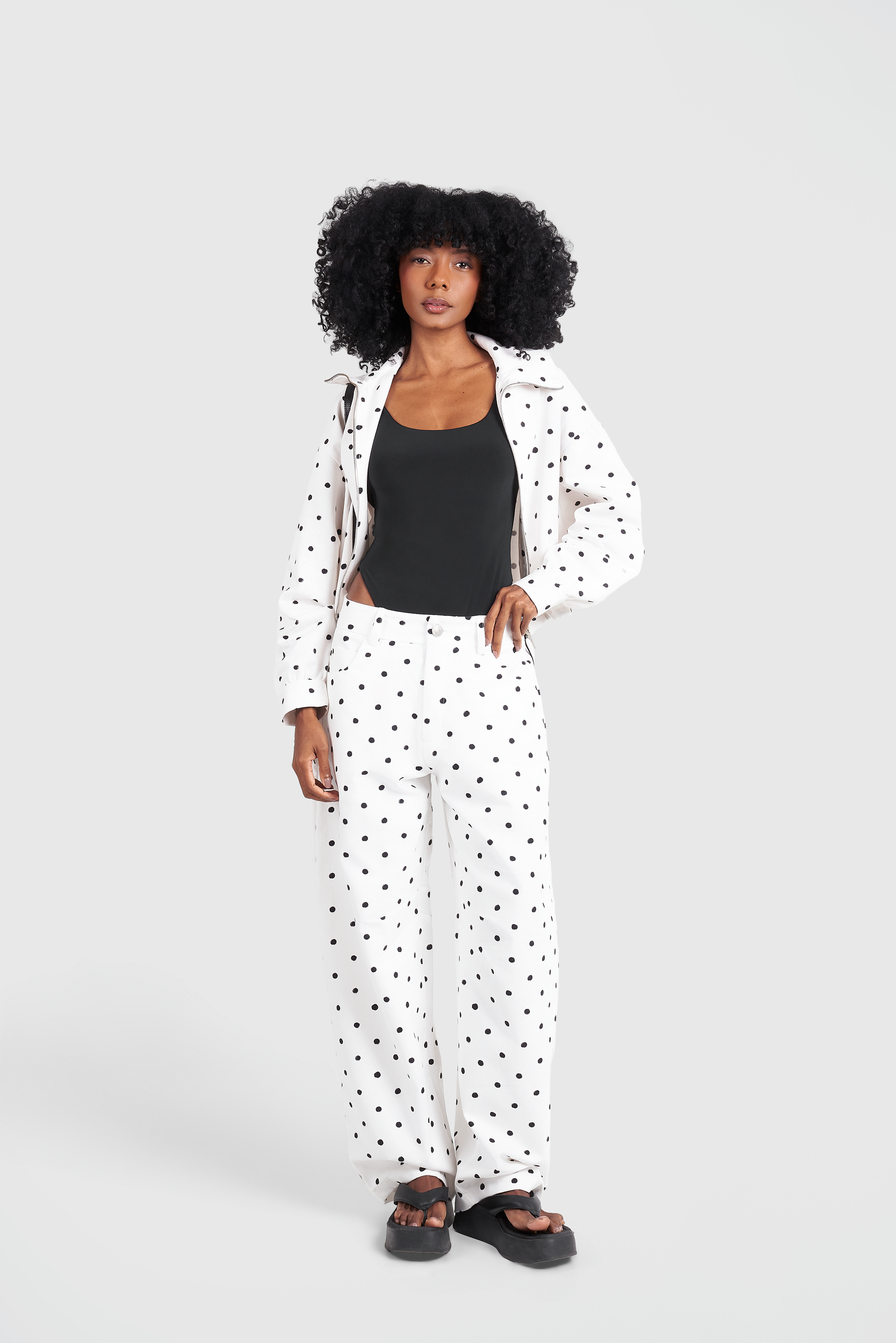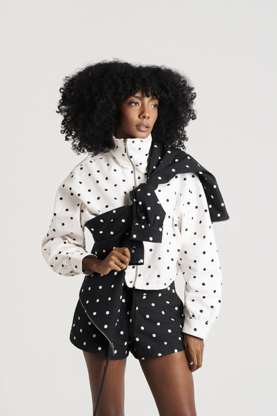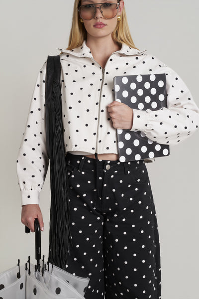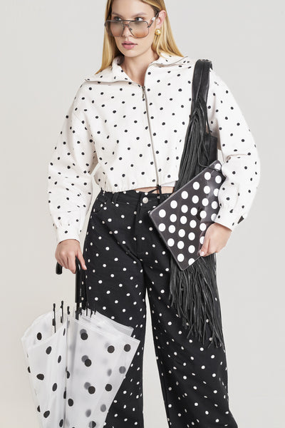 Jaqueta Polka White: harmoniza referências vintage com sensibilidade atual. Produzida em sarja durável, sua silhueta descontraída oferece liberdade de movimento sem comprometer a elegância. O padrão poá, expressão máxima de refinamento intemporal, protagoniza as criações de 2025, ressignificando um clássico que permanece relevante além das estações. Peça versátil e sofisticada, transita com naturalidade entre o casual elevado e o sofisticado acessível, adaptando-se a qualquer ocasião.
