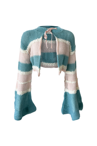 Leve e colorido, o cardigan cropped Bolero Sugar combina estilo retrô com um toque contemporâneo. Confeccionado em tricô com listras em tons pastel, apresenta mangas amplas com acabamento bufante e uma delicada amarração no pescoço, que adiciona sofisticação e romantismo. Parte da collab exclusiva com a Mafe Ganem, essa peça expressa criatividade e autenticidade, ideal para quem busca looks elegantes e confortáveis com personalidade marcante.